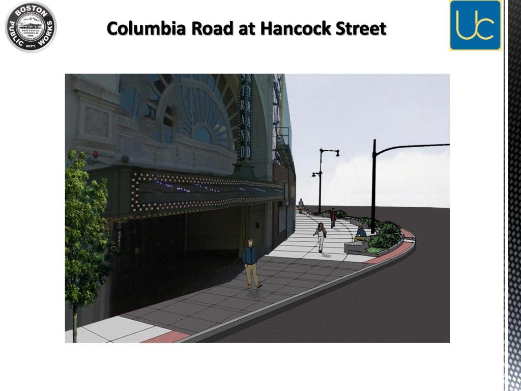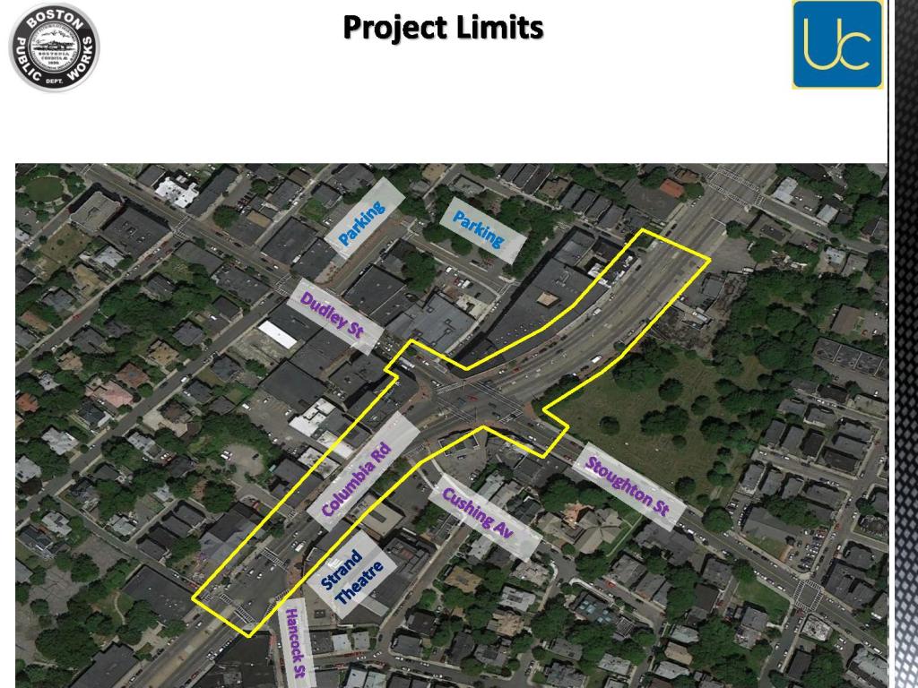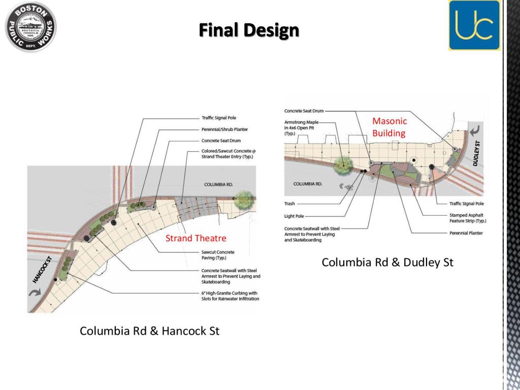 The City of Boston Public Works Department scope of work for this $3 million project included pedestrian accessibility, upgraded traffic signals, new sidewalks, tree plantings, new street lighting, and way-finding signage. Adding synchronized signals will help with traffic calming and pedestrian safety, and public amenities include spaces for future public art. View the slide show below or download the community presentation.