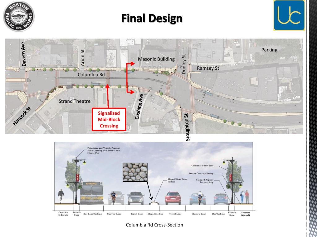 The project aims to preserve two-way vehicular travel along this 2.4 mile corridor between Franklin Park and Moakley Park. [The City] will also create a linear park, repurposing the existing median, sidewalks, and improving transportation connectivity for the surrounding neighborhoods. As Columbia Road has been identified as part of Boston’s High Crash Network, overall traffic safety will be a primary concern on this corridor.